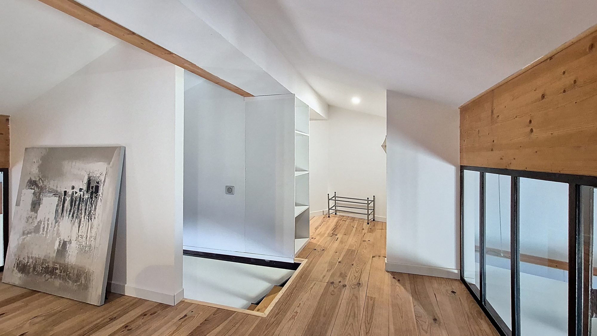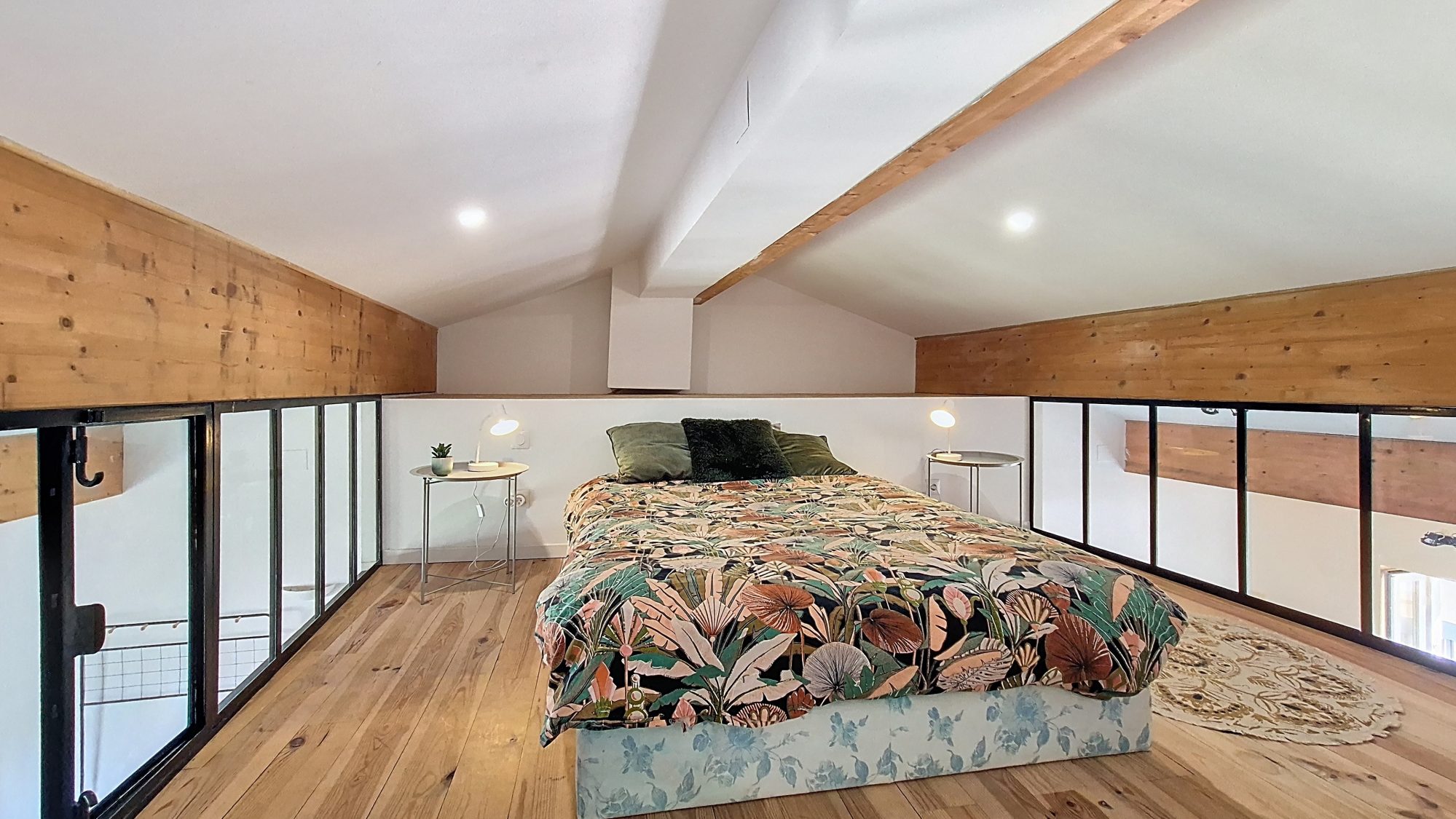 - Un espace nuit en mezzanine avec rangement de 18 m²