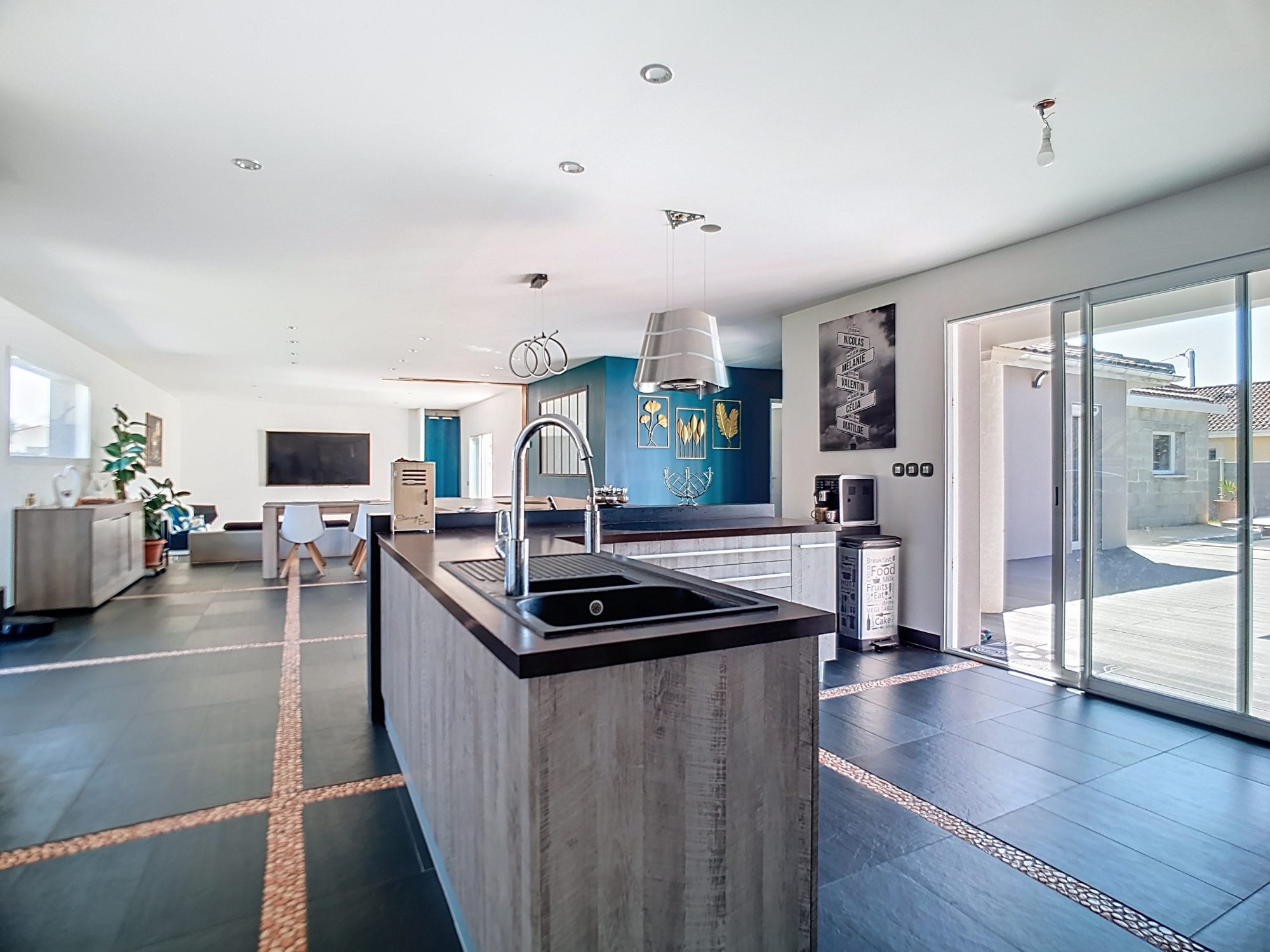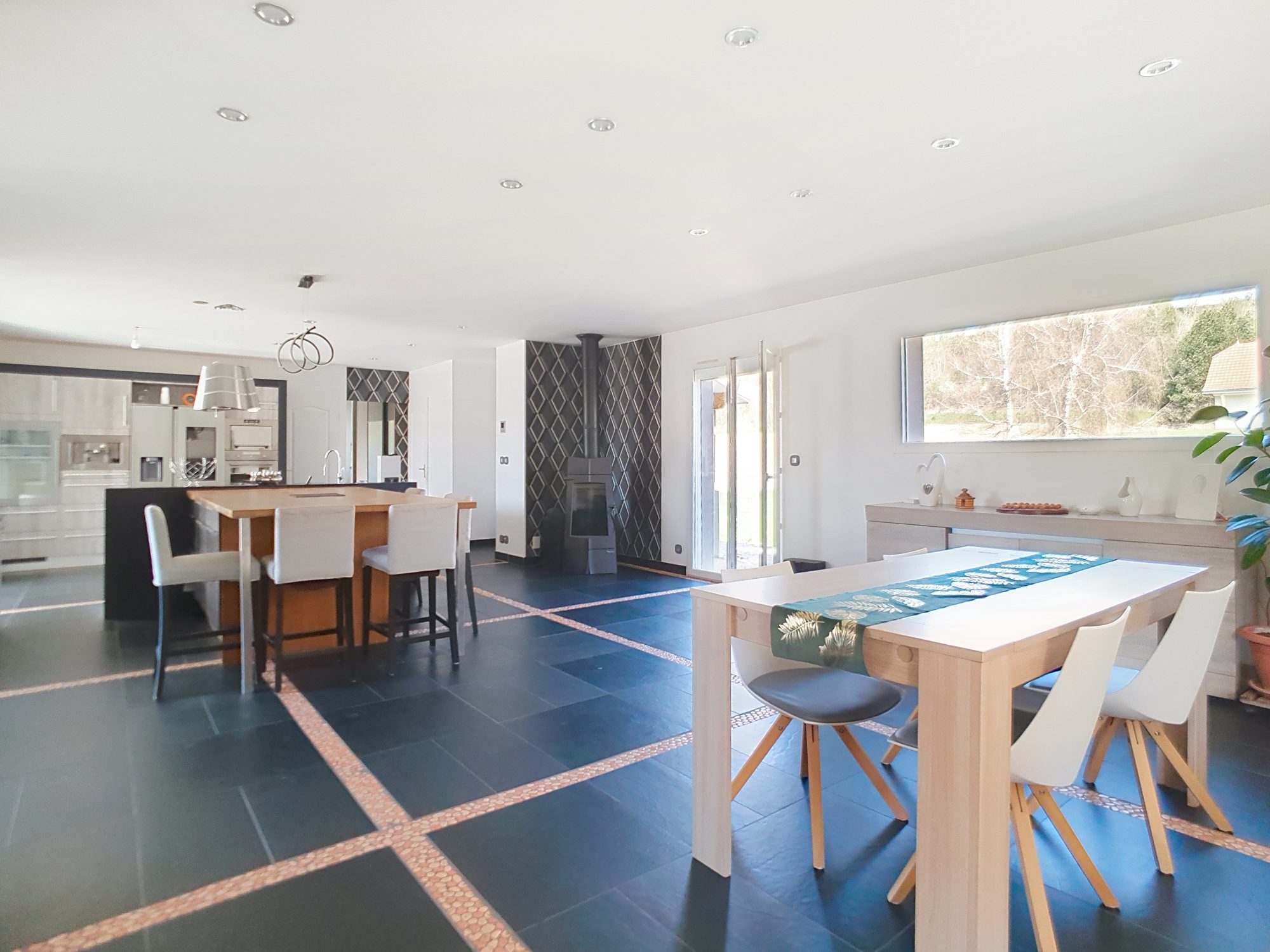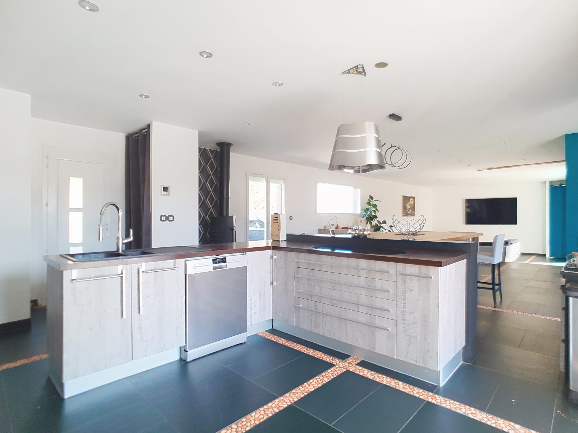 =) Cuisine équipée (Nombreux rangements, ilot central et table, plaque induction, hotte, four, micro-onde, cafetière, cave à vin)