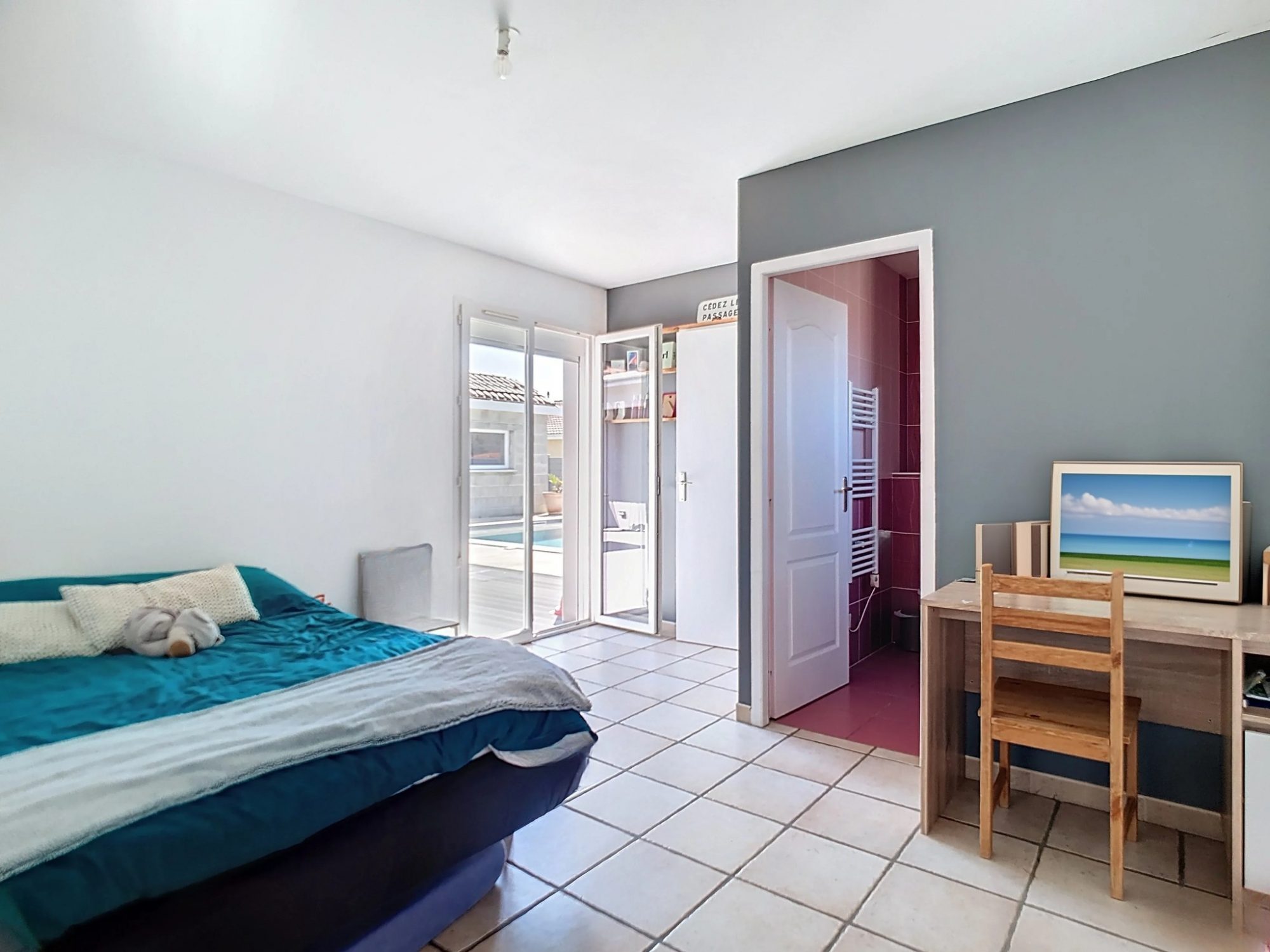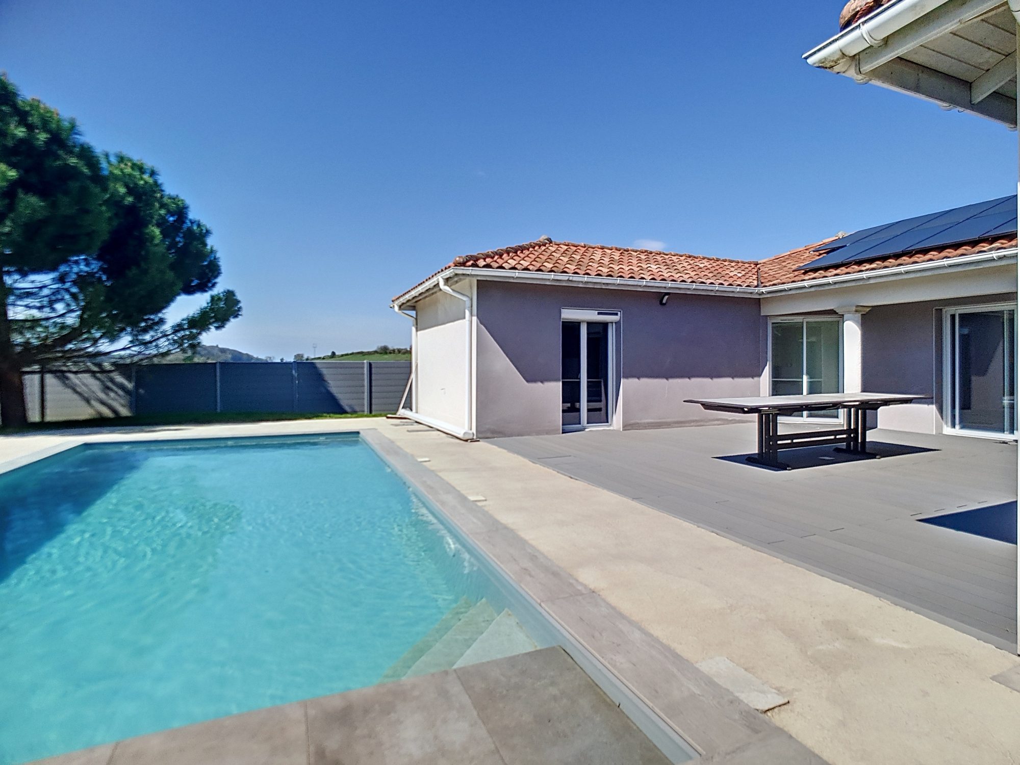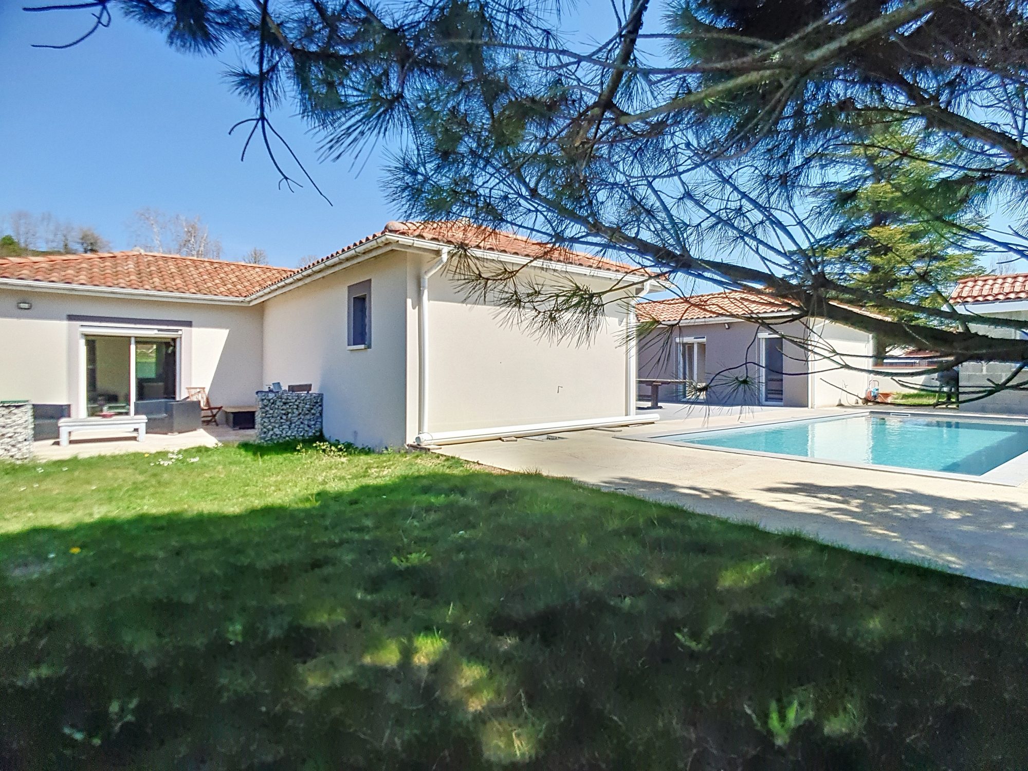 =) Piscine exposée plein Sud : 9*4 avec fond plat au chlore bâtie en 2022 + Rideau immergé + domotique